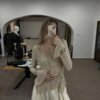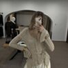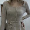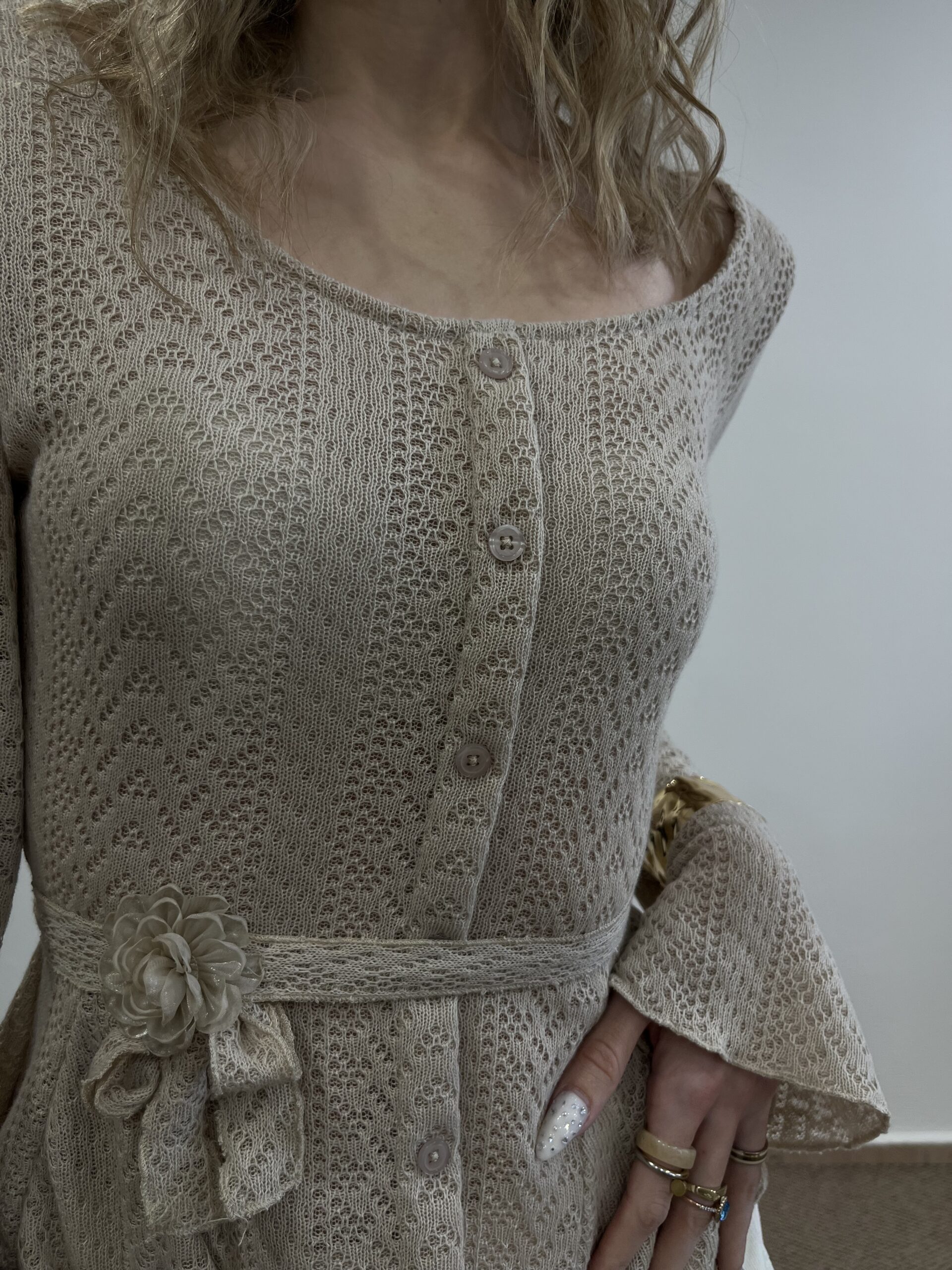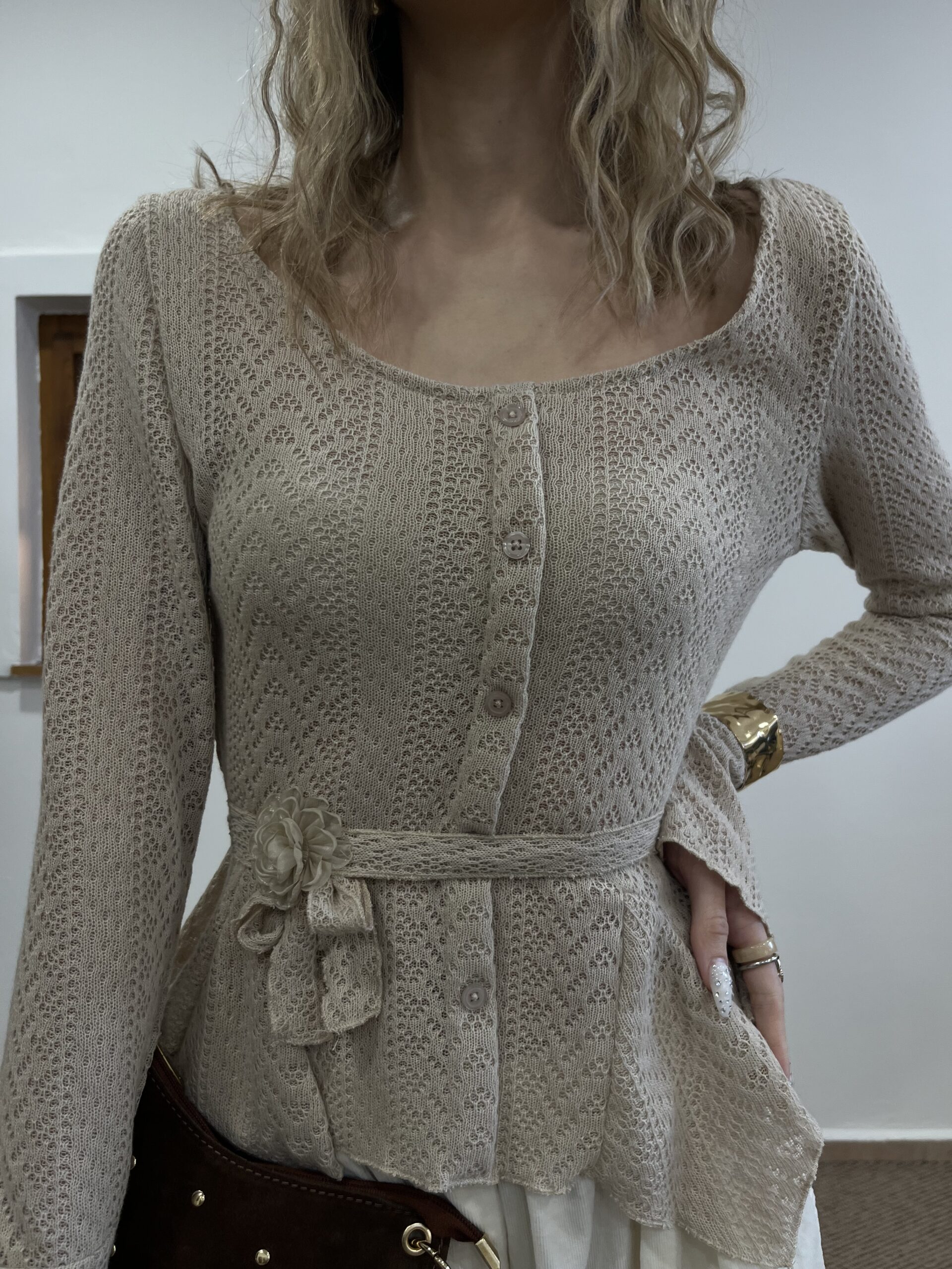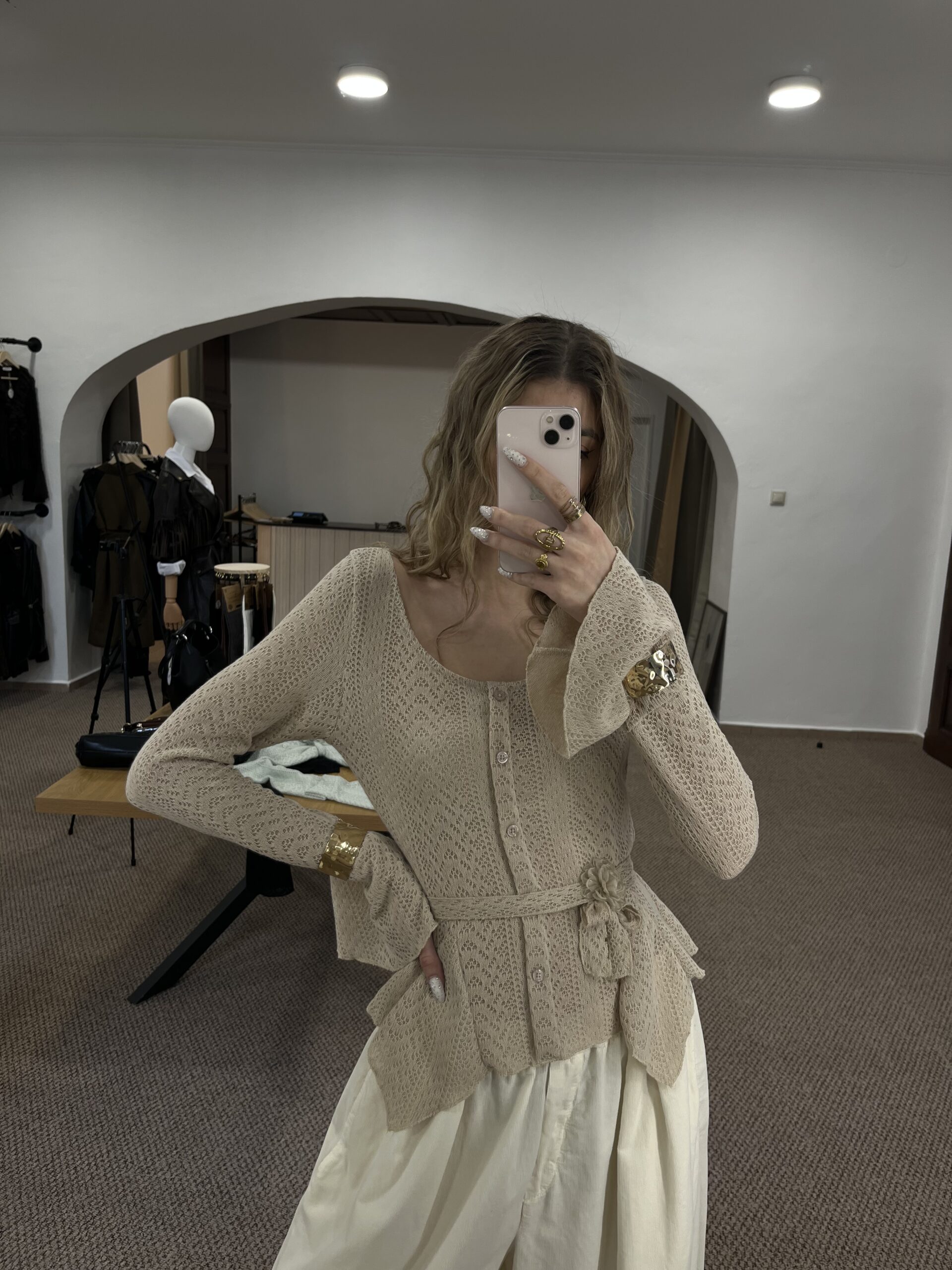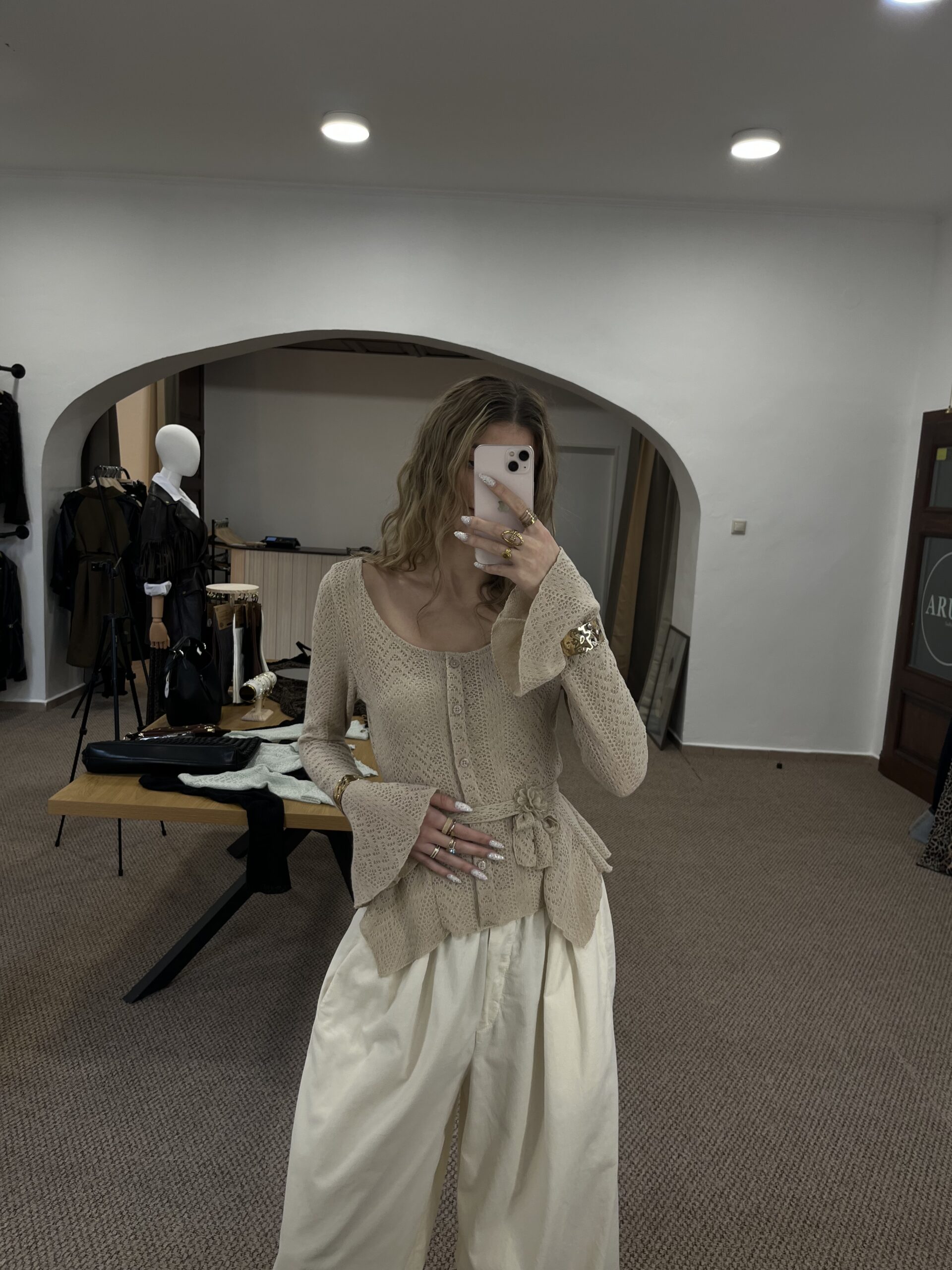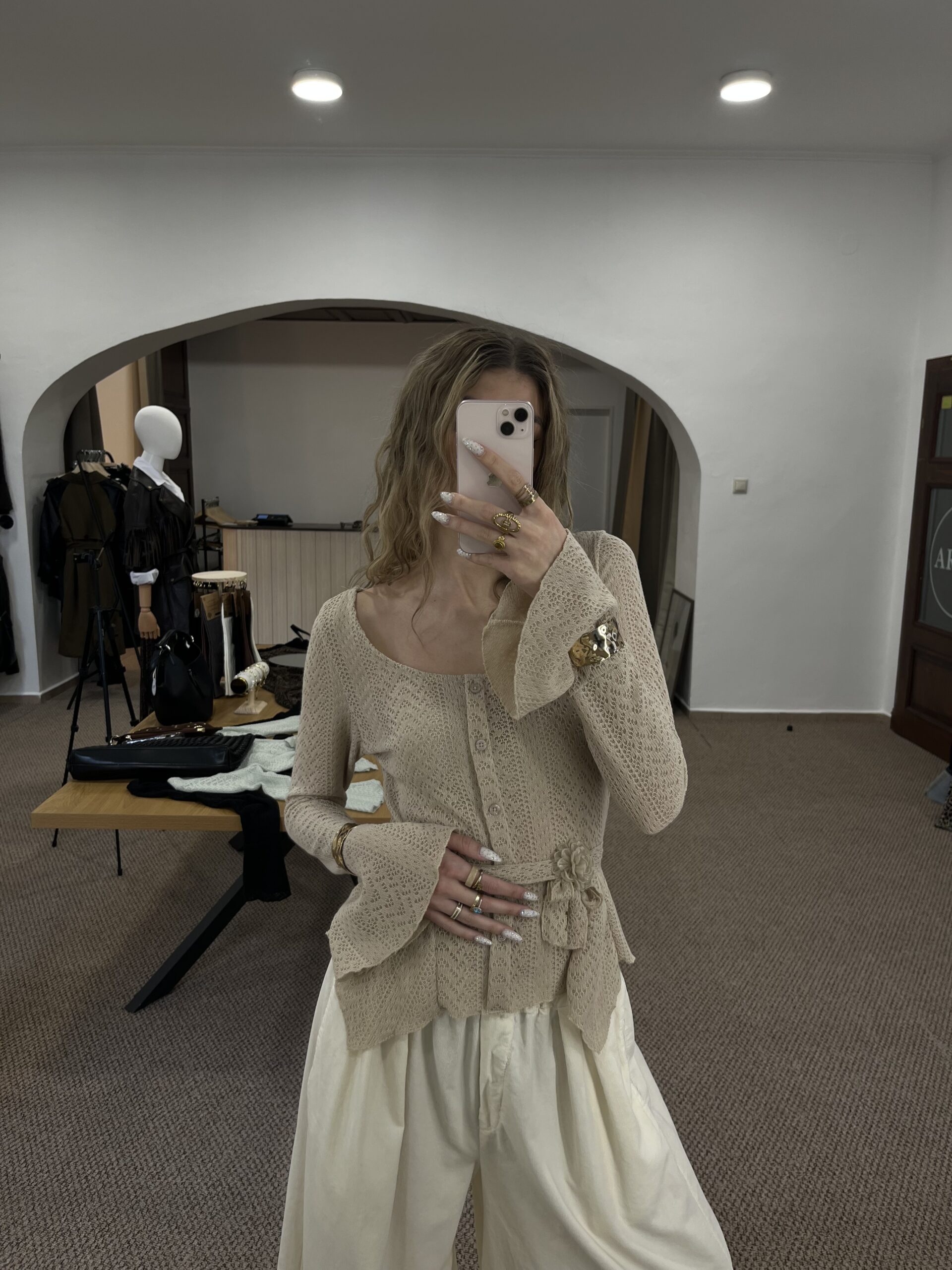 Jemný pletený top v béžovom odtieni, ktorý pôsobí romanticky a uvoľnene. Detailné dierkované pletenie, rozšírené rukávy a viazanie v páse opaskom krásne zvýraznia siluetu. Ideálny kúsok na vrstvenie. Skvelo vyzerá s džínsami, sukňou aj ľanovými nohavicami.