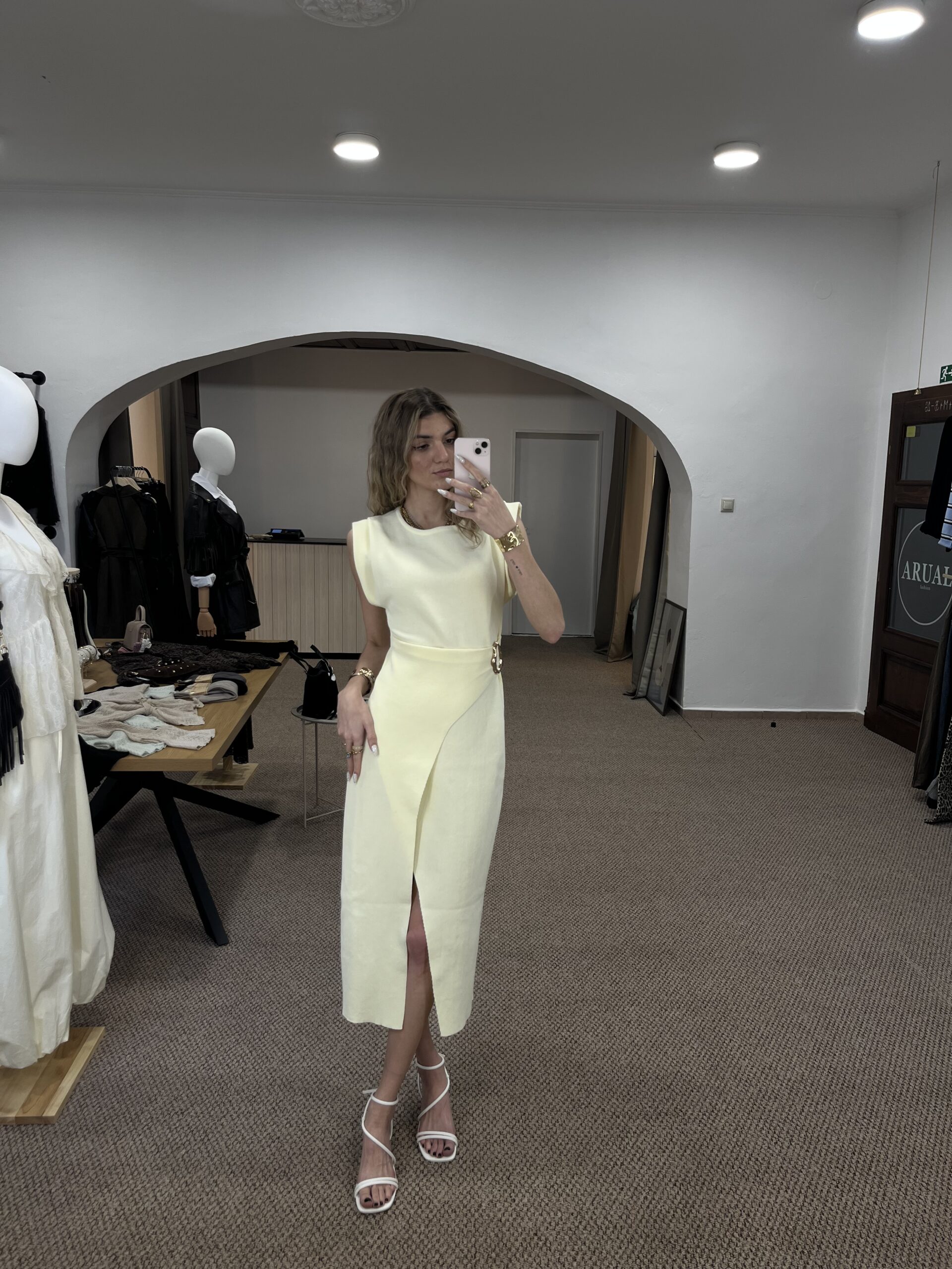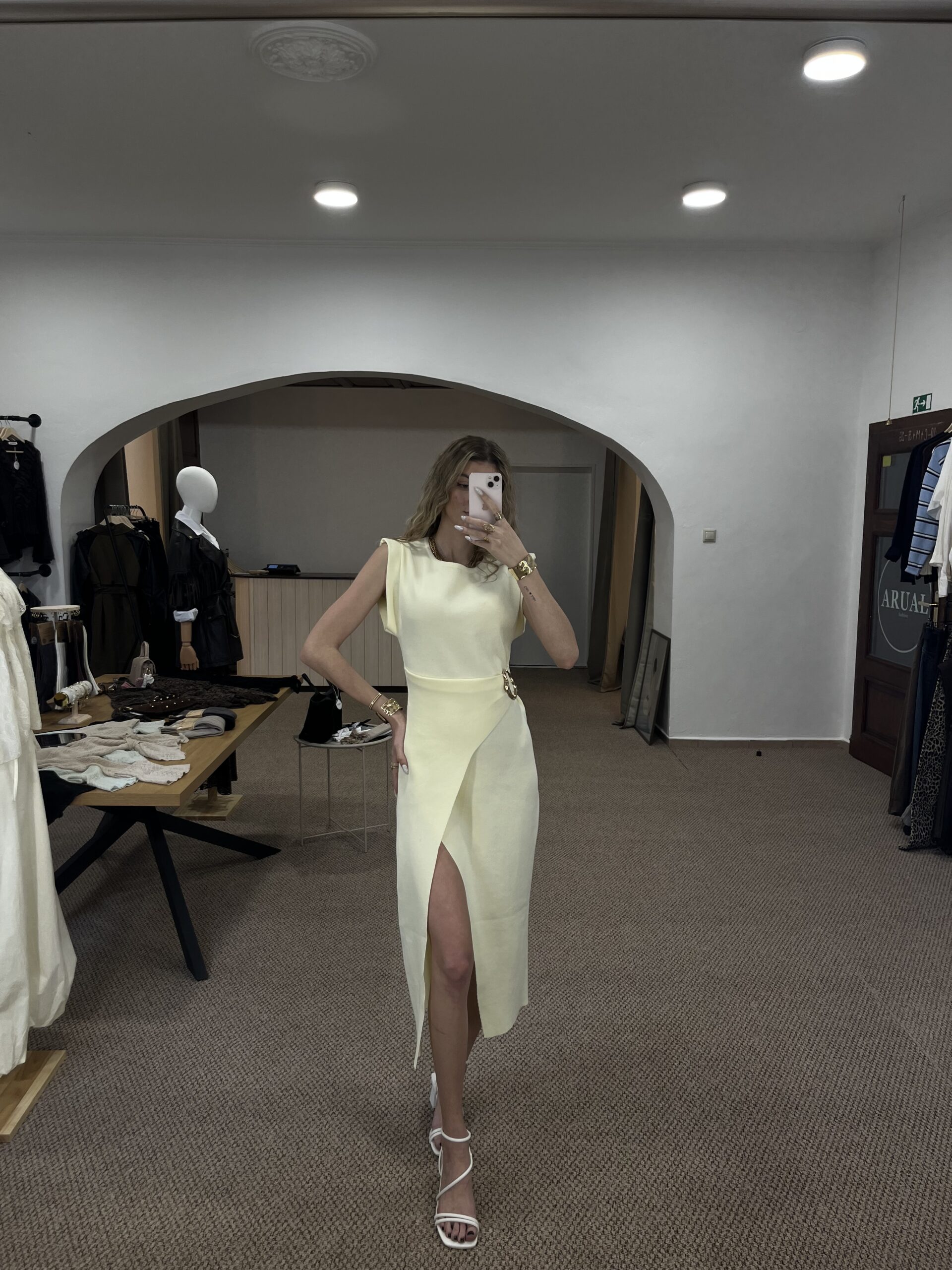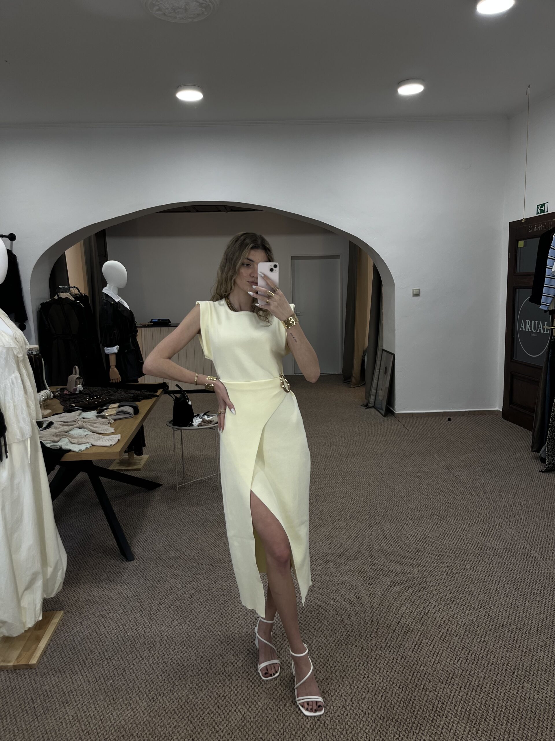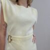 Elegantné šaty v jemnom žltom odtieni, ktoré pôsobia minimalisticky a veľmi žensky. Zvýraznený pás s dekoratívnou sponou krásne formuje postavu, zatiaľ čo asymetrický strih a rozparok dodávajú modelu šmrnc. Ideálne na špeciálne príležitosti, večeru aj letné eventy