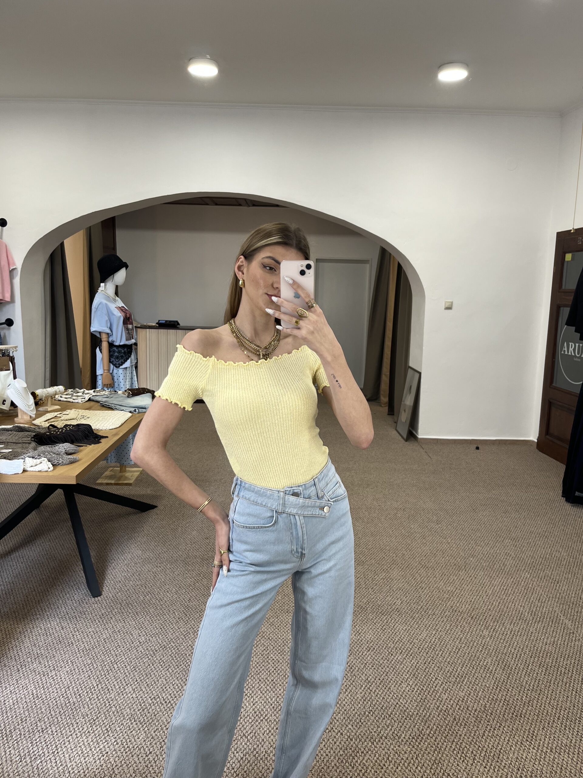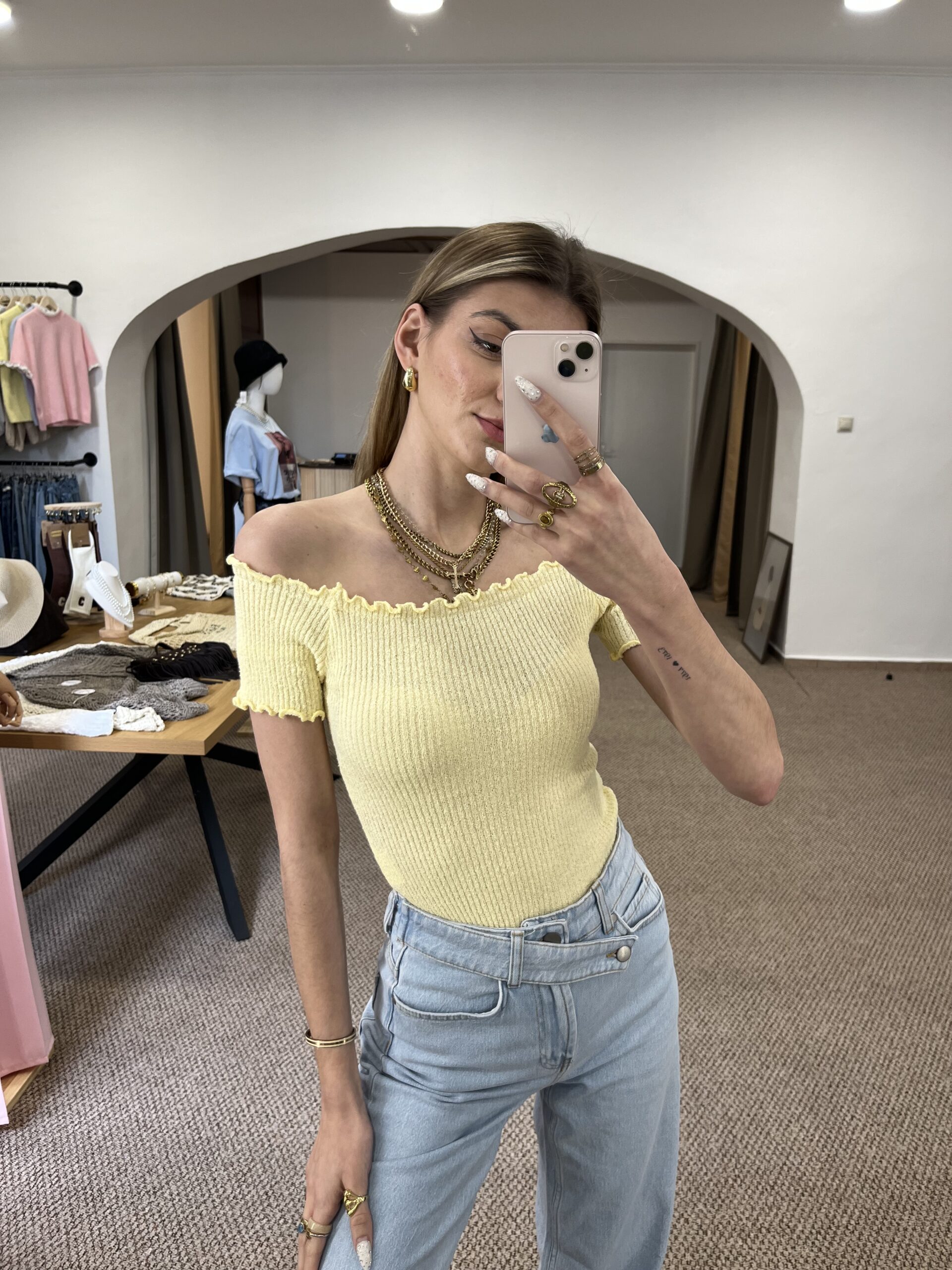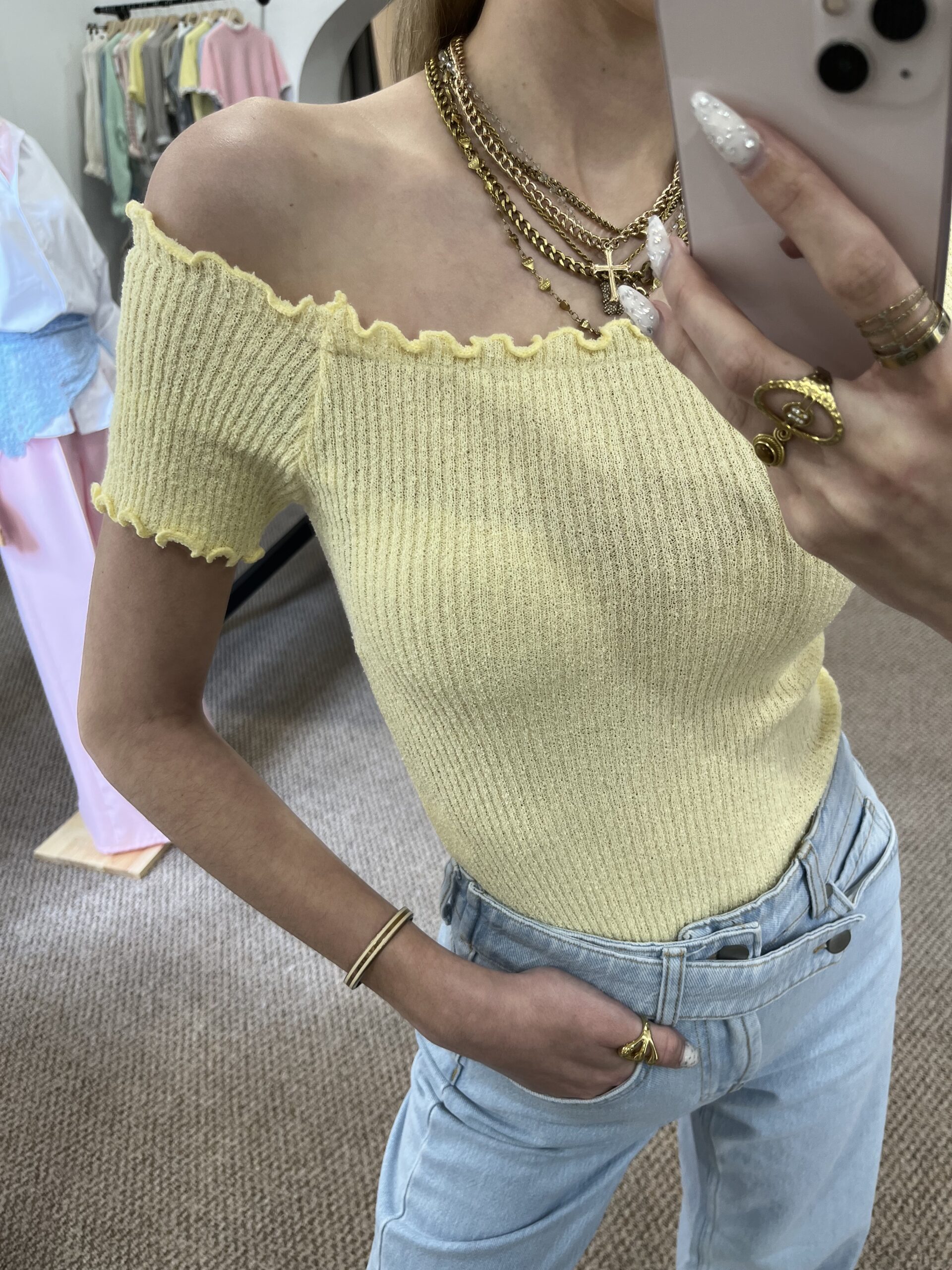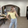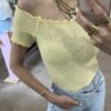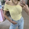 Jemný žltý top, ktorý krásne zvýrazní postavu. Príjemný elastický materiál, pohodlný strih a trendy odhalené ramená ideálny k rifliam aj sukni. Jednoduchý kúsok, ktorý oživí každý outfit.